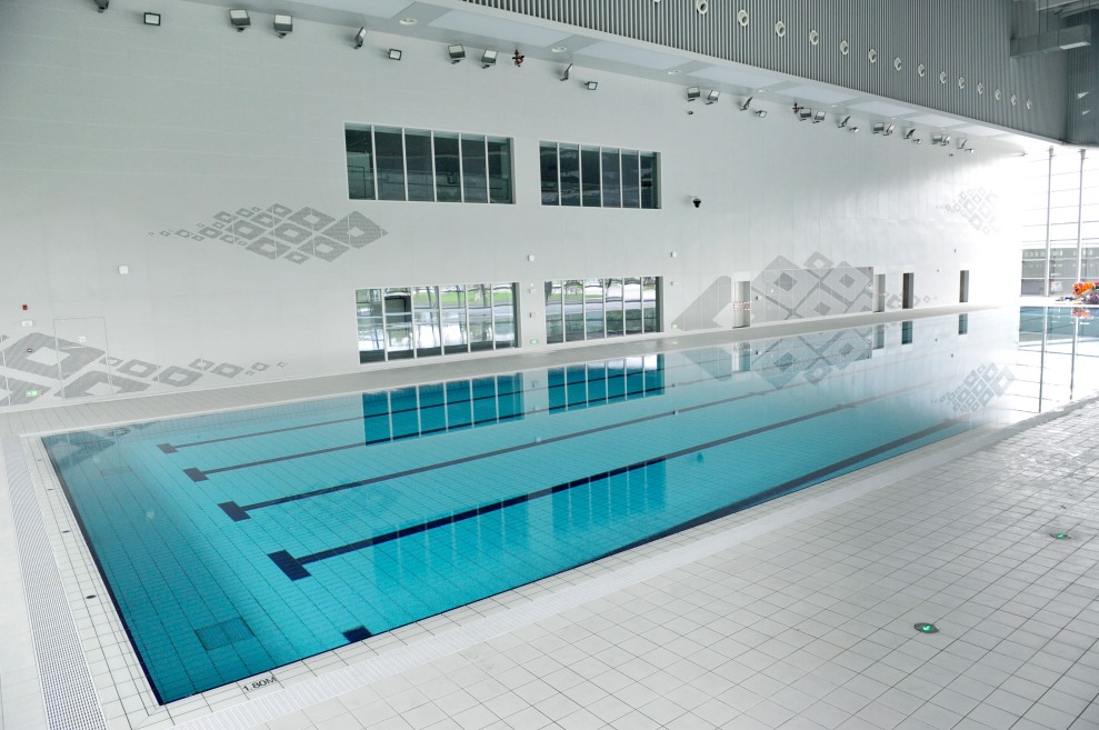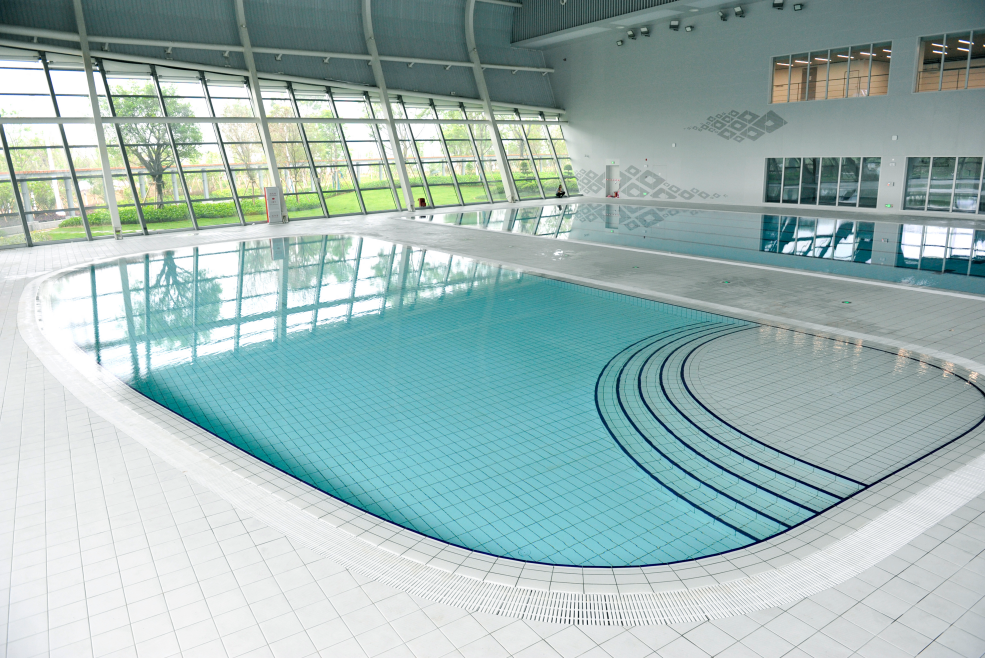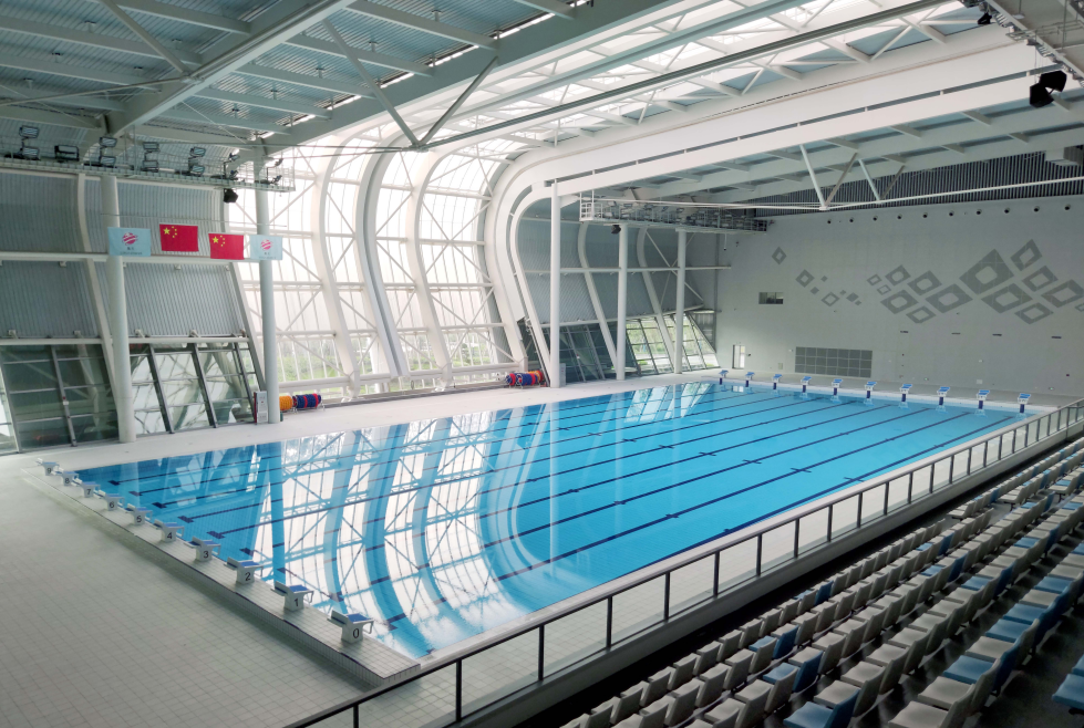 游泳館建筑面積約2.2萬m2,館內建設1個國際標準10道游泳比賽池,1個5道訓練池以及1個兒童戲水池。場館運用了國內領先的開合屋蓋技術,5分鐘之內能實現室內與露天泳池的切換。