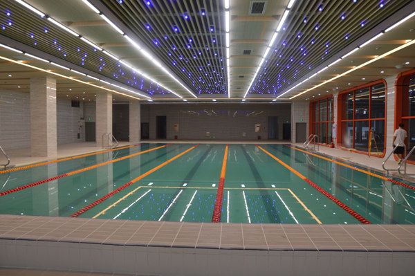 游泳池面積337.5平方米,有效水深1.2-1.8米,容積506.25立方米,循環時間3.2小時。水處理工藝設計中,采用了循環式水質維護系統和分流量臭氧消毒系統相結合。系統設計中運用現代科技,過濾系統采用了目前高標競賽池常用的硅藻土過濾設備,消毒系統結合了長效(氯)+瞬間(臭氧)消毒方式,從而保證了游泳池最優的水質;熱源采用鍋爐供熱;為保證游泳館空間的舒適性,泳池空間恒溫系統采用多功能除濕熱泵機組,游泳館內還設置了地暖。