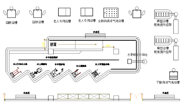 為了老年人健身的需要,池內設計了各式功能區,如老人專用浴槽、四肢浴槽、全自動渦流氣泡浴槽、蝶型浴槽且配有提升擔架、水上引體向上機、水上腳踏車、水上漫步機、水上健腹機、水上雙臂屈伸機、水中移動升降柱等。50m2大的一個健身池,功能卻能如此豐富多彩,盡顯聯盛水環境工程有限公司“營造健康、舒適的水環境”的企業文化理念。