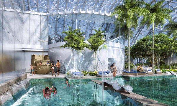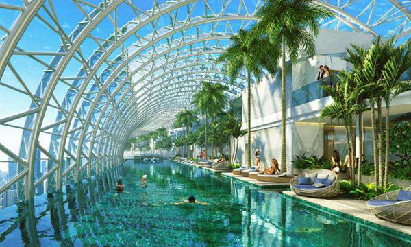 和世界聞名的新加坡濱河灣金沙酒店一樣,重慶來(lái)福士的無(wú)邊際泳池和水晶廊橋花園也是由建筑大師摩西·薩夫迪設(shè)計(jì)的,金沙酒店的空中花園和泳池是建在建在57層,200米的高空中,而重慶來(lái)福士廣場(chǎng)則是金沙酒店的升級(jí)2.0版——建在60層樓,250米的高空中,這也是建筑大師摩西·薩夫迪在中國(guó)的一大建筑突破。