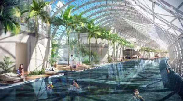 該水晶廊橋花園水景觀系統(tǒng)由無(wú)邊際游泳池和花園水療水景觀組成。無(wú)邊際游泳池區(qū)域由413.7平方米成人池+47.5平方米兒童池組成,水深1.2米~0.5米, 總水量543.5立方米;水工藝采用逆流循環(huán)+分流量臭氧消毒,并配吸附罐+鹽氯發(fā)生器,采用智能控制系統(tǒng),接入樓宇監(jiān)控系統(tǒng)。水療水景觀部分配波光水景、小品瀑布、戲水小品等,泳池旁設(shè)置溫泉花園,水面面積為66.8平方米,水深0.55米,總水量36.7立方米。水療水景觀配氣泡盤、水氣按摩座椅、水氣噴頭、按摩噴咀等設(shè)施,所有循環(huán)泵均有備用泵,并配置緊急停泵按鈕,救生員附近設(shè)置緊急停止按鈕。