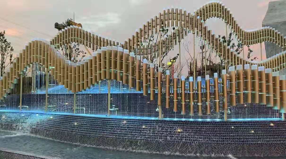 其中主入口水景——山型雕塑水景設計及施工難度較大,它融合了水簾噴頭及燈效、雕塑專業,經過深化設計而成。每一步的設計都必須有理有據,才能在美觀性,水簾及燈光效果以及抗風強度上達到要求。