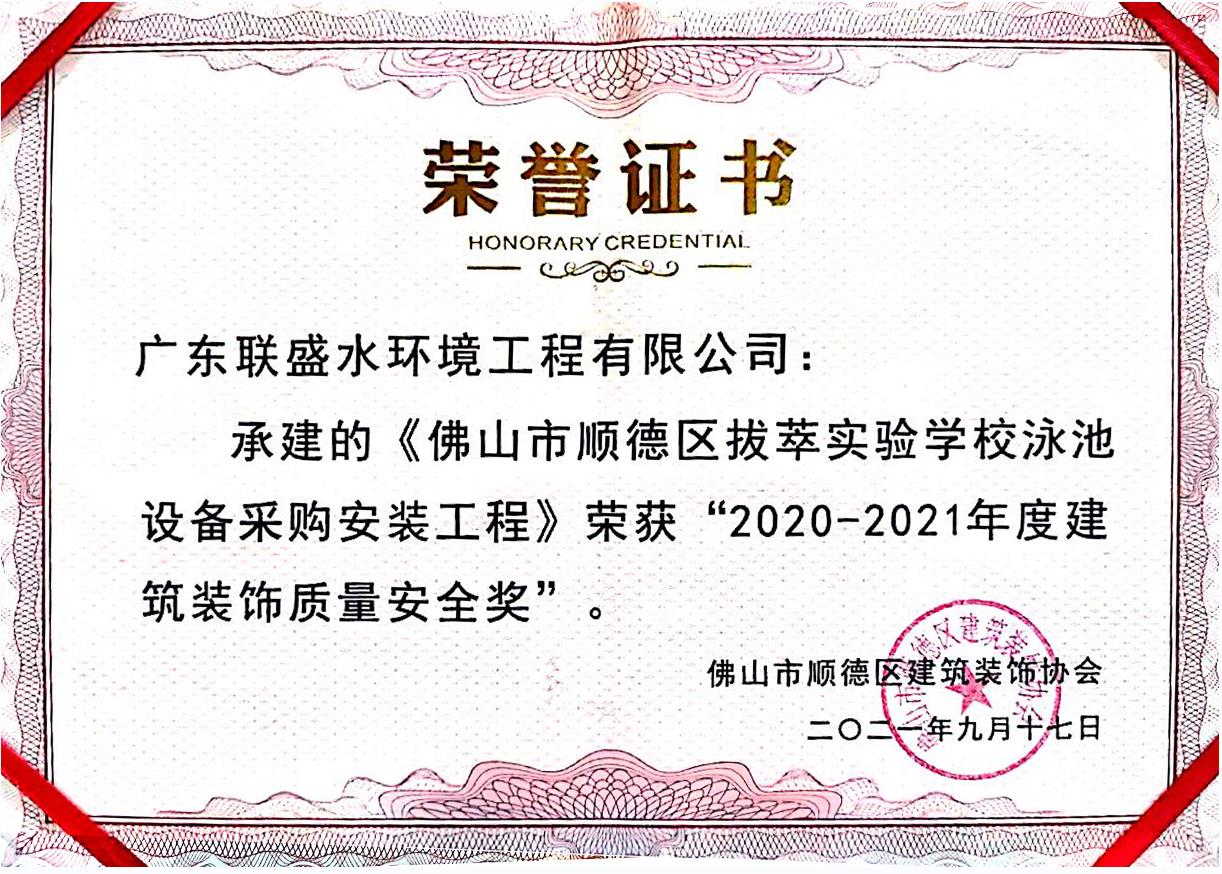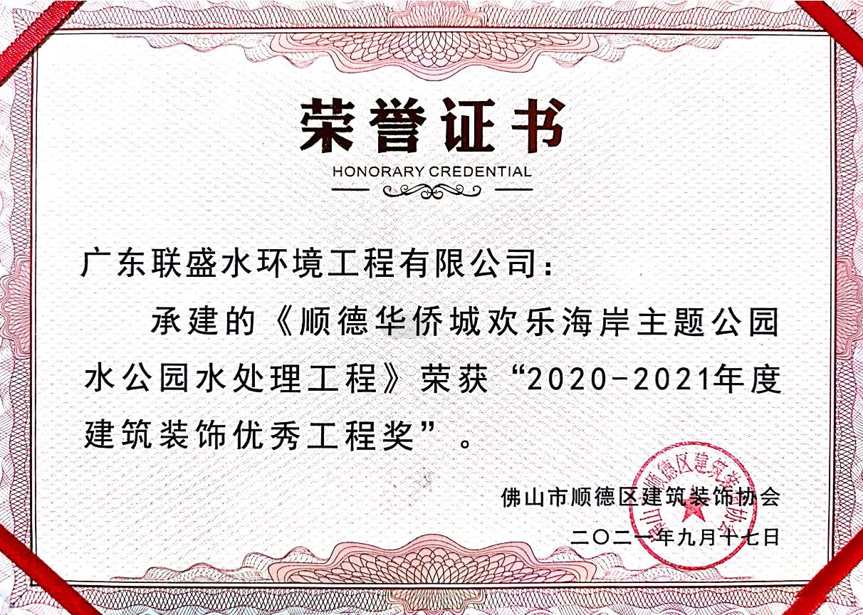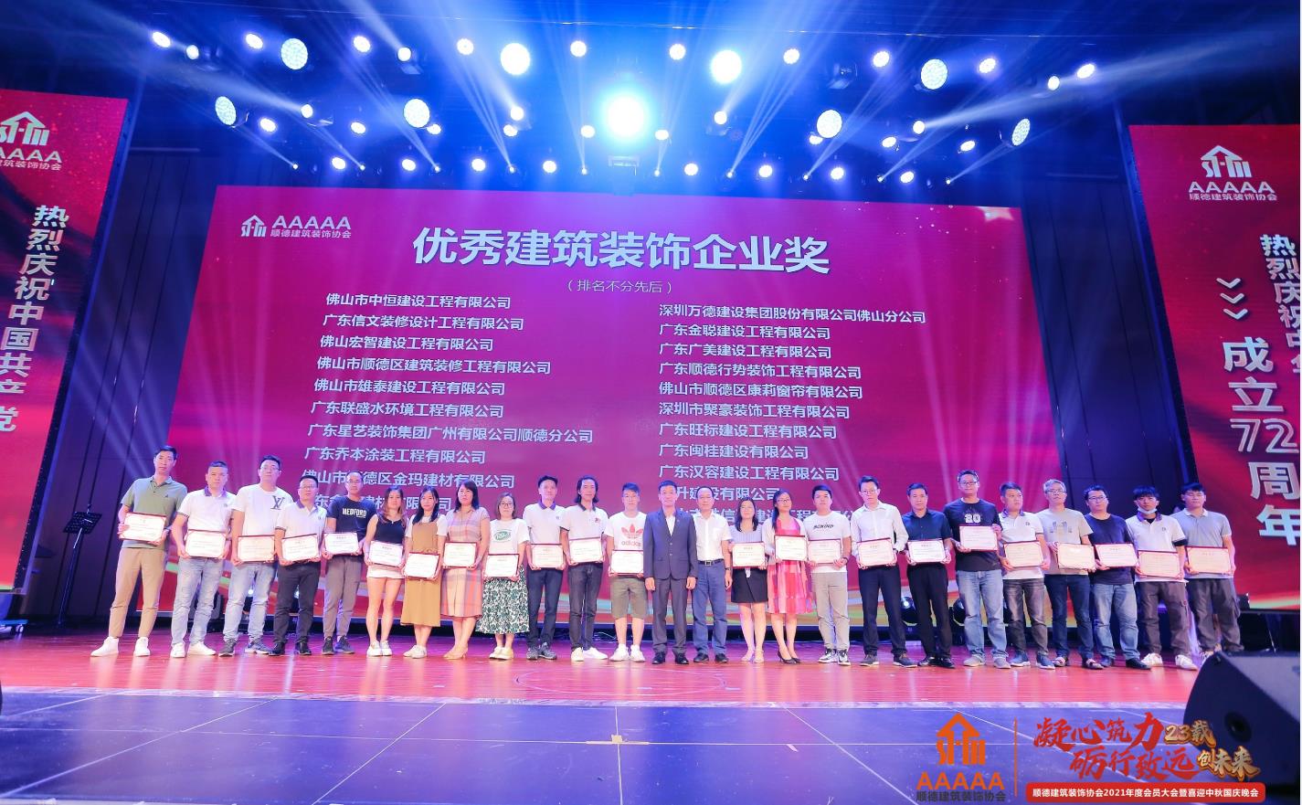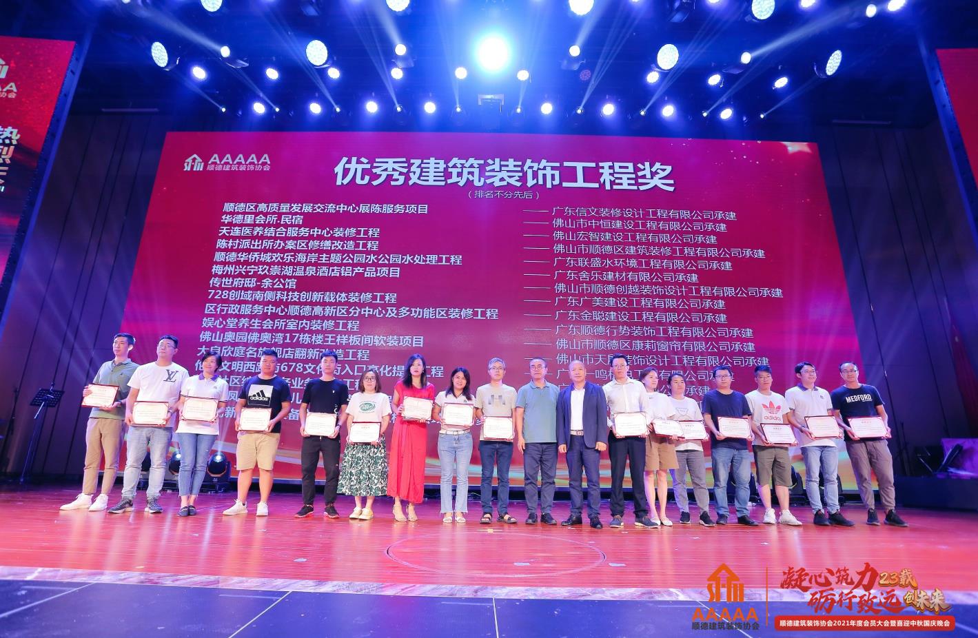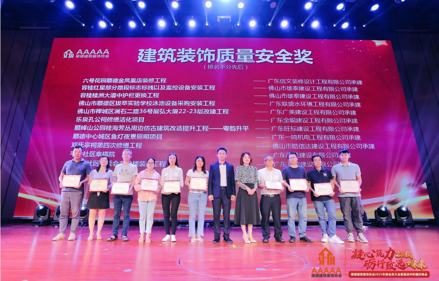 在協會舉辦的頒獎儀式中,聯盛公司榮獲“2020-2021年度建筑裝飾行業優秀建筑裝飾企業獎”,且憑借承建的順德華僑城歡樂海岸主題公園項目榮獲“2020-2021年度建筑裝飾優秀工程獎”,順德拔萃實驗學校項目榮獲“2020-2021年度建筑裝飾質量安全獎”。作為贊助企業,聯盛公司也獲得了協會頒發的關于支持協會共享基金捐贈及晚會贊助的感謝狀!