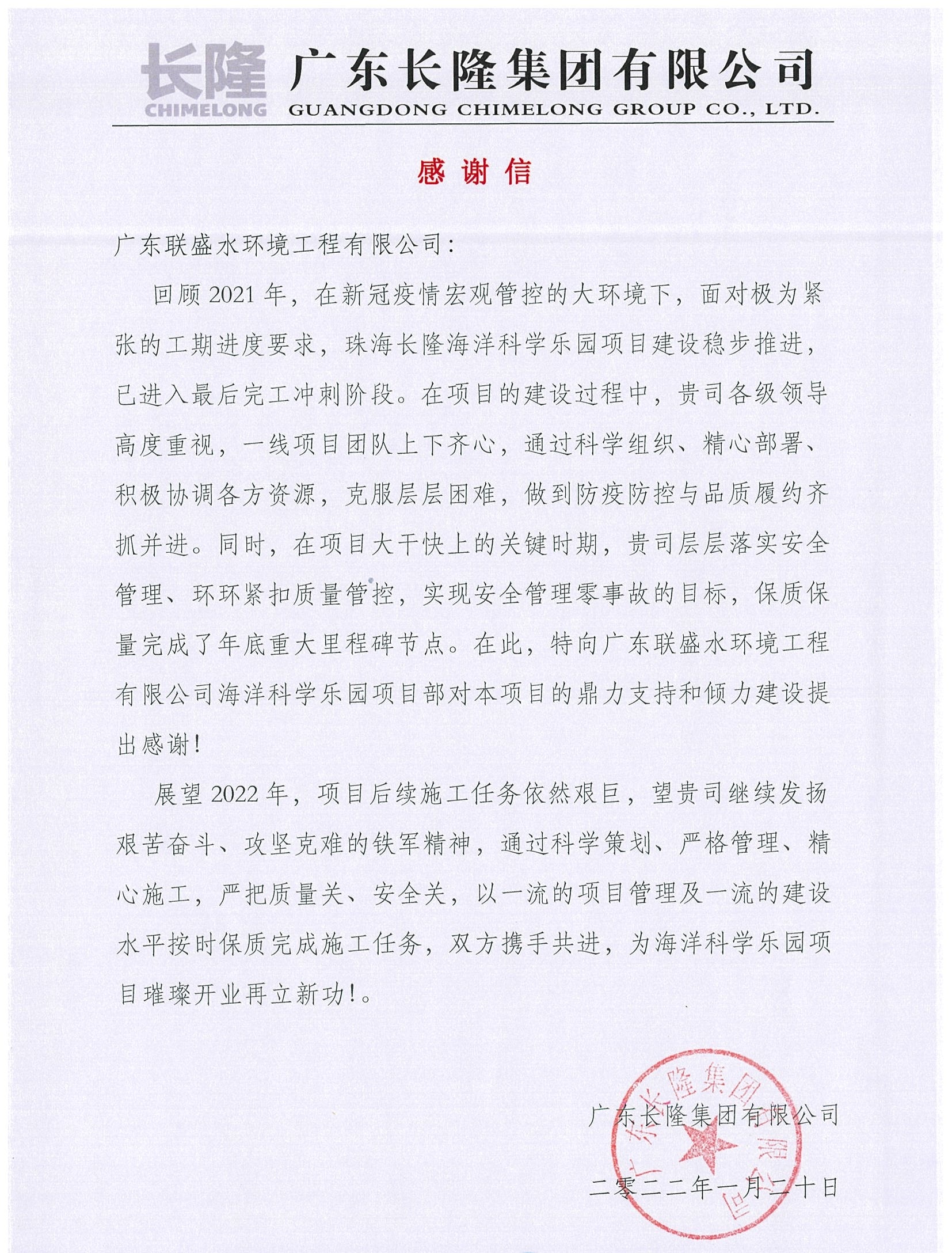 近日,廣東聯(lián)盛水環(huán)境工程有限公司收到了一封來(lái)自廣東長(zhǎng)隆集團(tuán)有限公司的感謝信,信內(nèi)容如下: