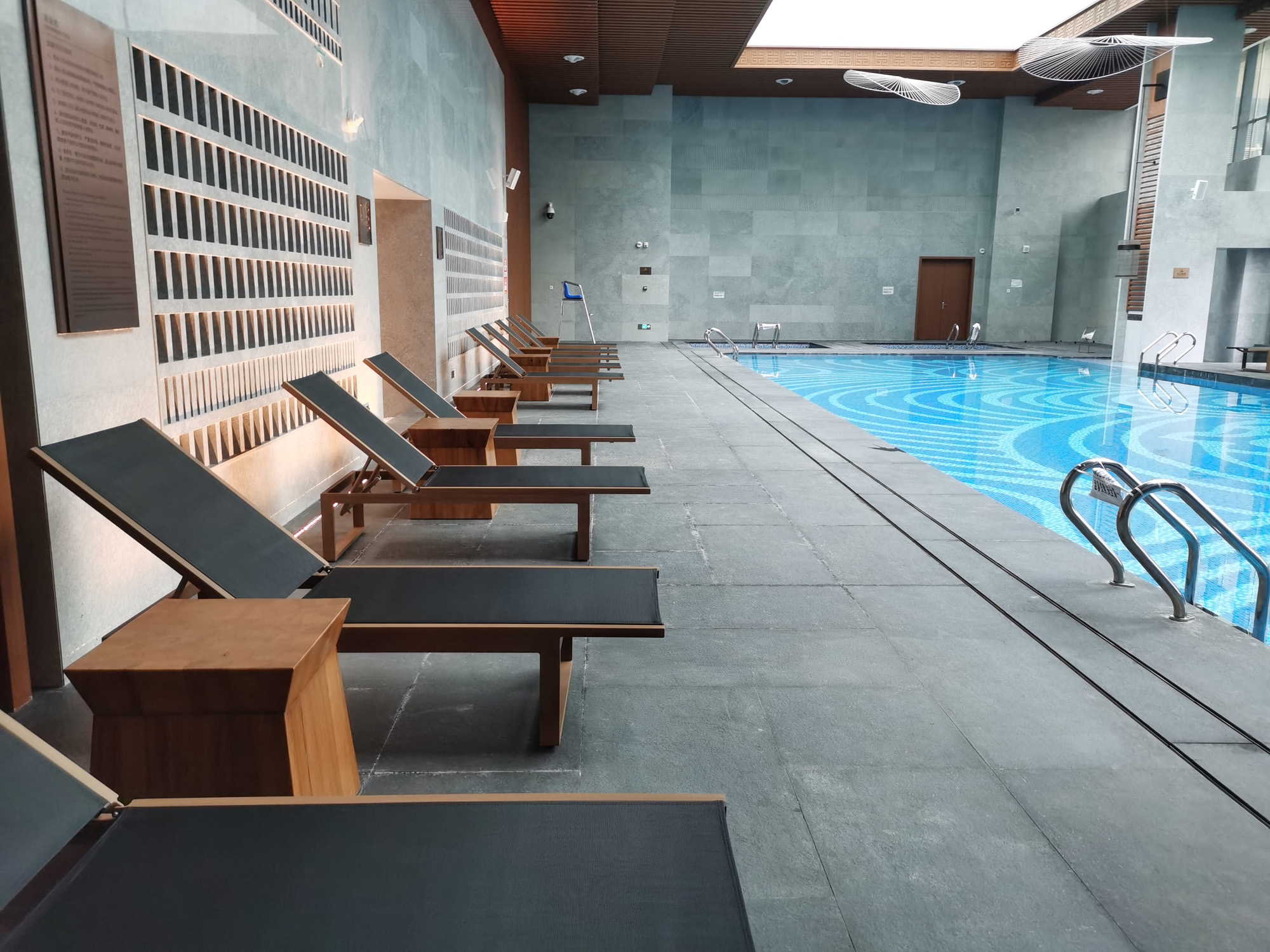 泳池空間以高雅的白色和華麗的金色為主色調,結合清澈見底的藍色泳池,整體呈現出清雅而含蓄的中式美。
