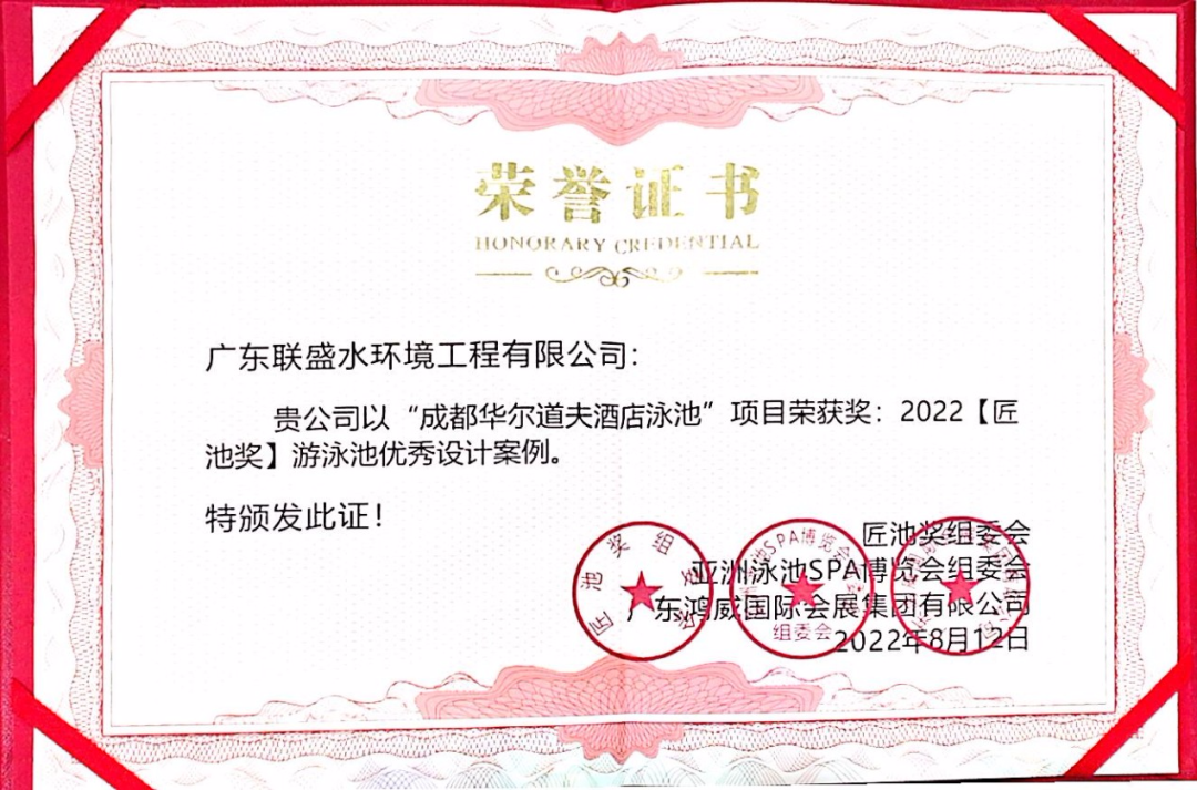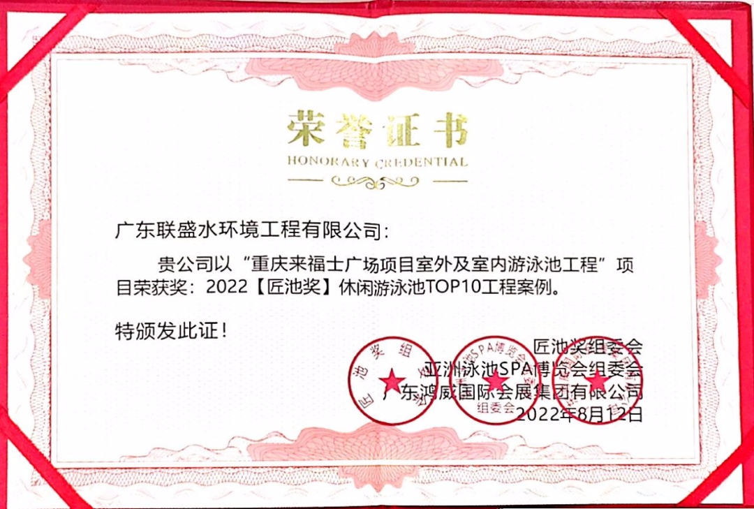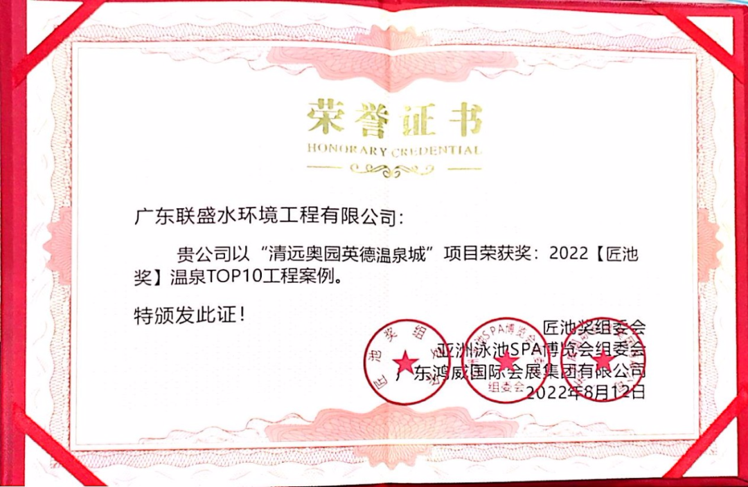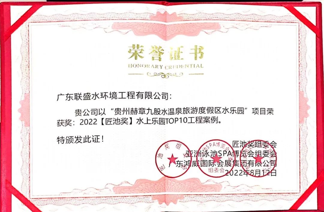 匠池獎已成功舉辦了多屆評選活動,每年歷經(jīng)9個月的優(yōu)秀工程案例征集和評選,通過專家點評和網(wǎng)絡(luò)投票評選出了眾多的優(yōu)秀工程案例。“水環(huán)境生態(tài)行家”——廣東聯(lián)盛水環(huán)境工程有限公司憑借在泳池、溫泉、水上樂園領(lǐng)域的品質(zhì)工程,連續(xù)多年獲得了諸多榮譽。