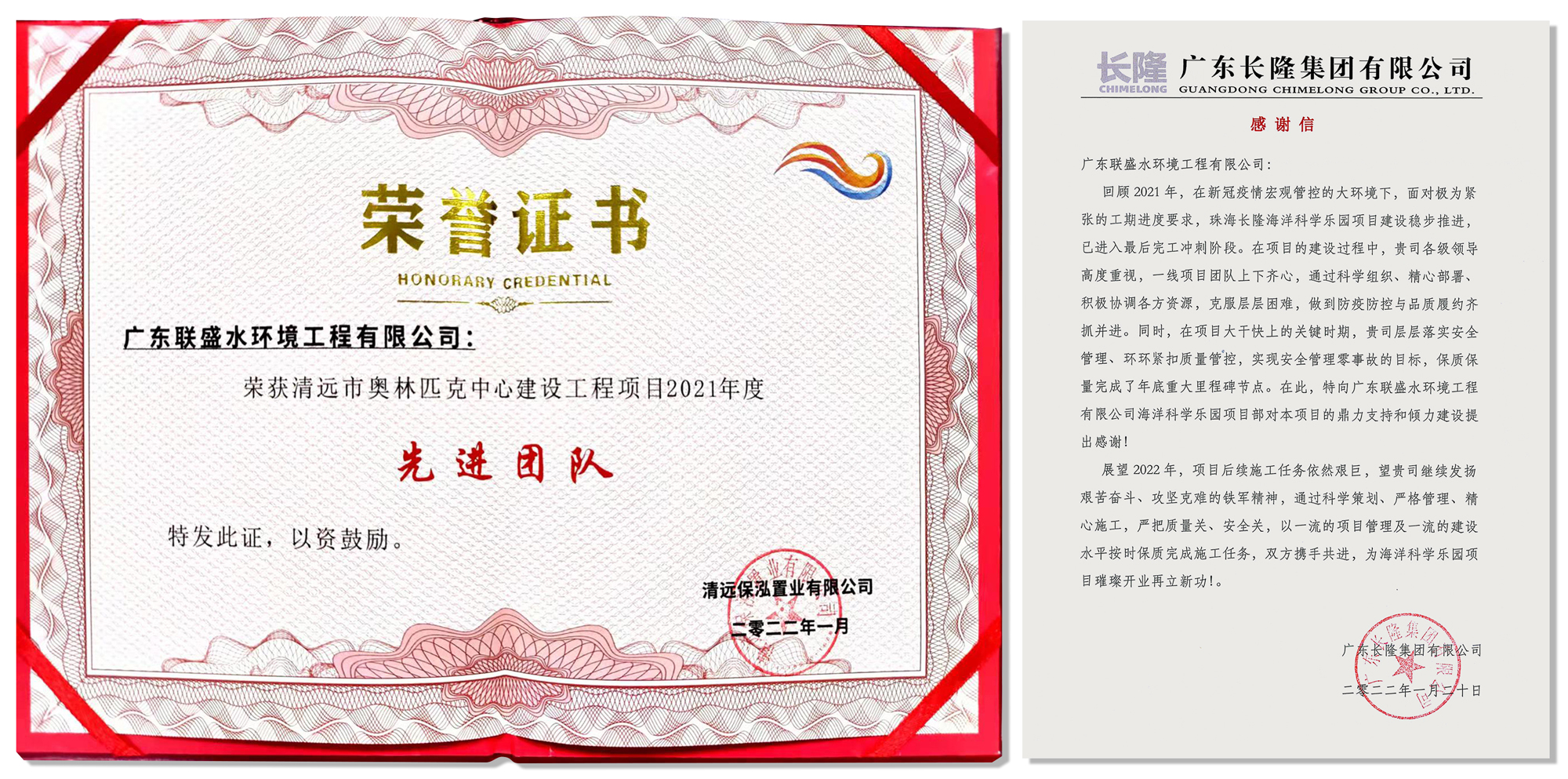 保利集團頒發的“先進團隊獎”(左)長隆集團頒發的感謝信(右)