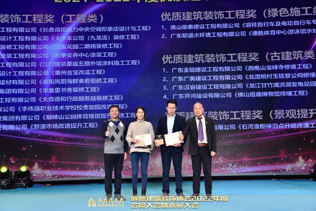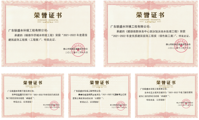 在頒獎儀式中,聯盛公司憑借承建的德勝體育中心游泳館泳池水處理工程榮獲“2021-2022年度優質建筑裝飾工程獎(綠色施工類)”,順德華僑城水特效工程榮獲“2021-2022年度最佳建筑裝飾工程獎(景觀提升類)”。