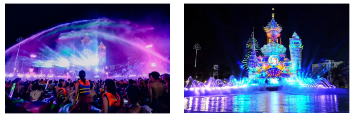水幕屏障長52米、高30多米,視野覆蓋整個造浪池區。以水光矩陣、50臺光束水柱、100米霧森特效、60套動感二維水柱、14套氣爆、6套互動式加特林水槍、激光等表演形式,營造出一幕幕環繞式、互動式、立體式的裸眼激光沉浸式視覺盛宴。